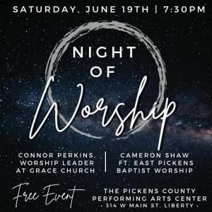 OUR LINE Upward WILL INCLUDE Great MUSIC FROM CAMERON SHAW FT. E PICKENS BAPTIST CHURCH WORSHIP. CAMERON SHAW IS A Contemporary CHRISTIAN ARTIST AND SONGWRITER FROM KING, NC WHO AIMS TO POINT PEOPLE TO FAITH AND HOPE IN JESUS CHRIST AND TO ENCOURAGE PEOPLE STRUGGLING WITH THEIR Religion. HIS SOULFUL STYLE OF SINGING AND WRITING IS ROOTED IN HIS FAITH IN CHRIST. Be SURE TO Encounter CAMERON AFTER THE CONCERT. HE ENJOYS MEETING PEOPLE, SEEING HOW HE CAN SERVE THEM IN…